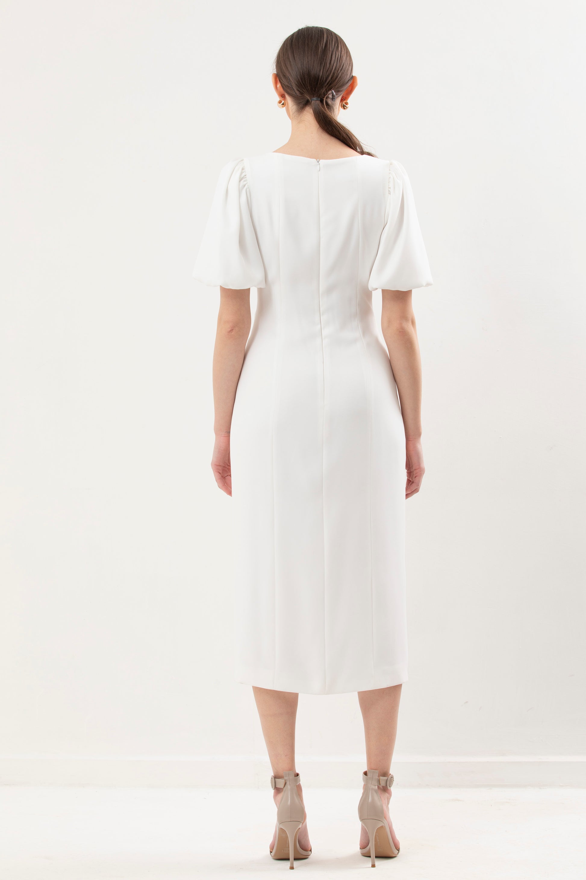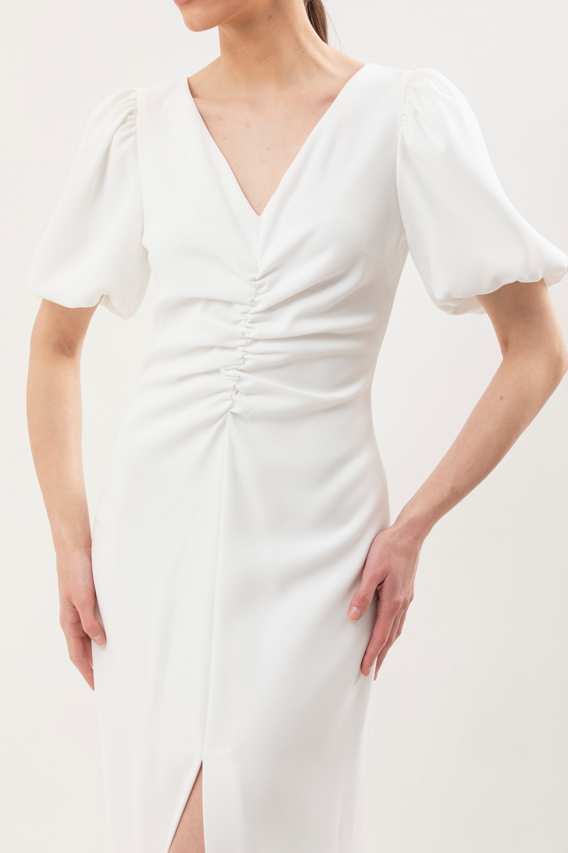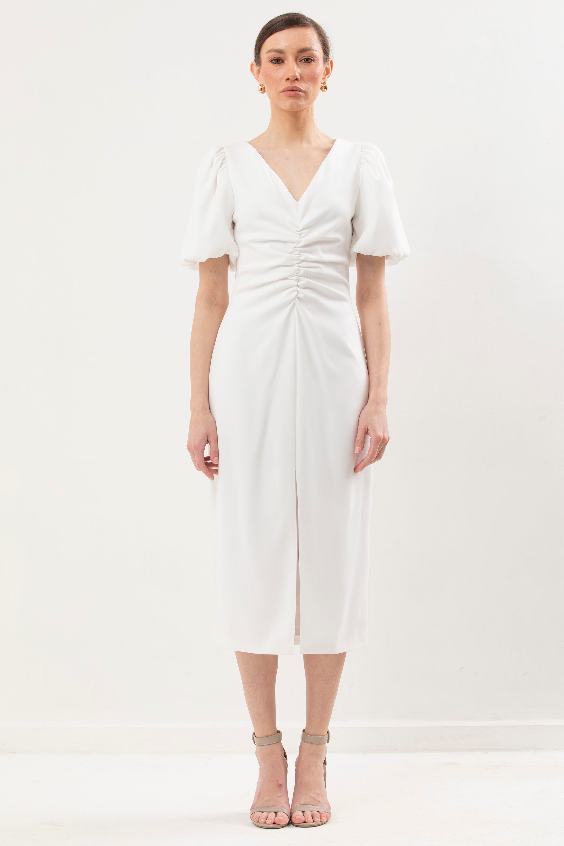 Rushed Dress With Front Slit and 1/2 Puff Sleeves
